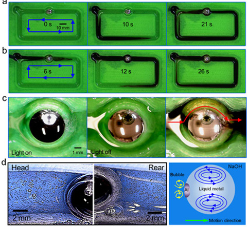 可变形液态金属机器在内含电解液的容器或各种槽道中的自主运动情形。