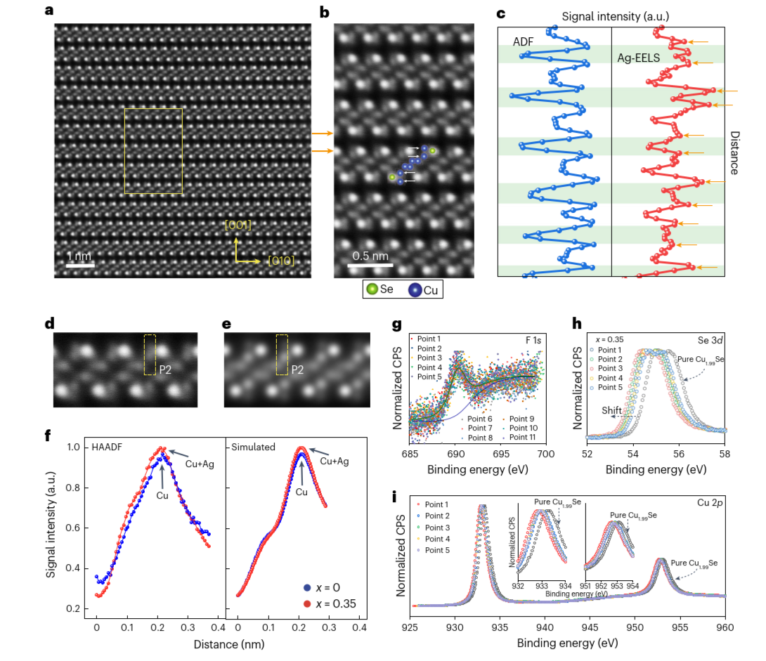 为了突破这一难题,精品无码久久久久久久久_国产精品一区二区三区四区五区_欧美亚洲国产激情一区二区_午夜精品久久久久久久久久久久_亚洲欧洲中文日韩久久AV乱码_91精品欧美一区二区三区_久久精品一区二区免费播放_日韩高清大片永久免费入口_久久国产欧美日韩精品免费_欧美一区二区三区久久综合_国产精品天天狠天天看材料学院李敬锋教授课题组与朱静院士课题组开展合作,先后在Cu2Se的晶体结构表征及其热电性能提升机理研究等方面取得一系列研究进展。在前期工作的基础上,研究团队提出利用阴阳离子共掺杂,通过增强元素电负性差异及空间障碍作用,从而提高铜离子激活能以抑制其长程迁移的新思路(图1)。发现在Cu2Se中掺入少量氟化物(AgSbF6)既能显著改善材料稳定性,又能显著提高热电性能,热电优值(ZT值)突破该材料体系的最高值,达到3.0(1050K),其热电模块的实测转换效率达到13.4%,并经120次循环仍没有出现明显的性能劣化(图2)。团队利用先进电子显微学方法和X射线光电子能谱确认了阴(F-)、阳(Ag+)离子的共掺杂(图3),占据Cu位的大尺寸Ag离子结合增强的Cu-F键能可以显著抑制Cu离子长程迁移及电离,从而有效提升材料的稳定性。