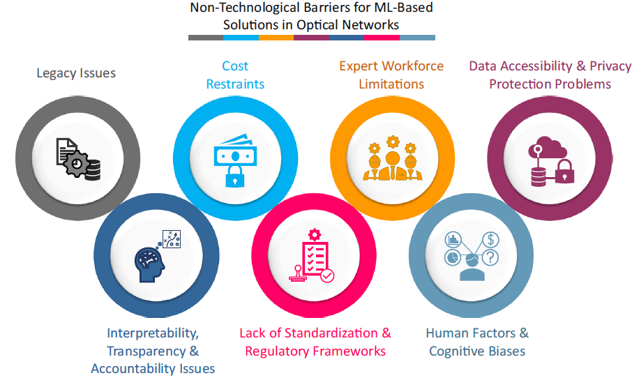 图1.机器学习辅助方法在实际光纤网络中面临的七个关键非技术挑战
