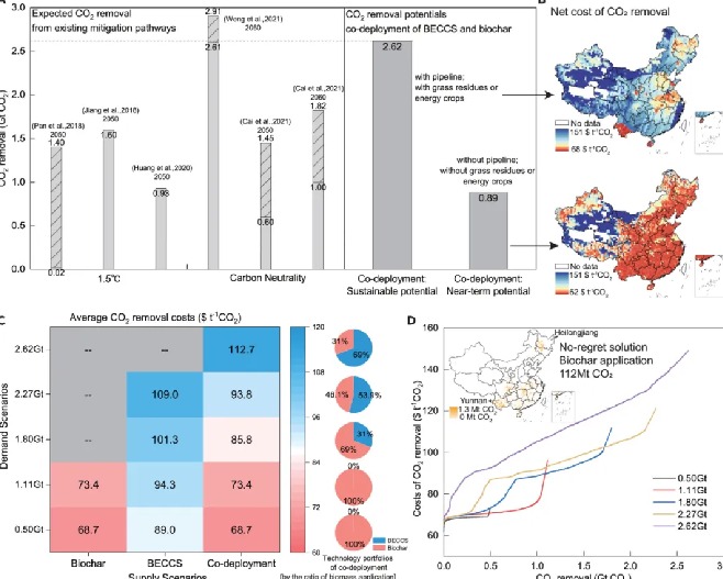 清华新闻网1月10日电 为实现碳中和目标,有必要在实施深度减排战略的同时部署二氧化碳移除(Carbon Dioxide Removal,CDR)技术,以抵消难减排行业的剩余排放。其中,两种生物质碳移除技术——生物能源结合碳捕集与封存技术(Bioenergy with Carbon Capture and Storage,BECCS)和生物炭(Biochar)——各有利弊,联合部署或能最大限度地发挥碳移除潜力,同时降低环境影响,但当前没有研究量化联合部署的潜力和经济可行性,阻碍了碳移除的早期和深度部署。