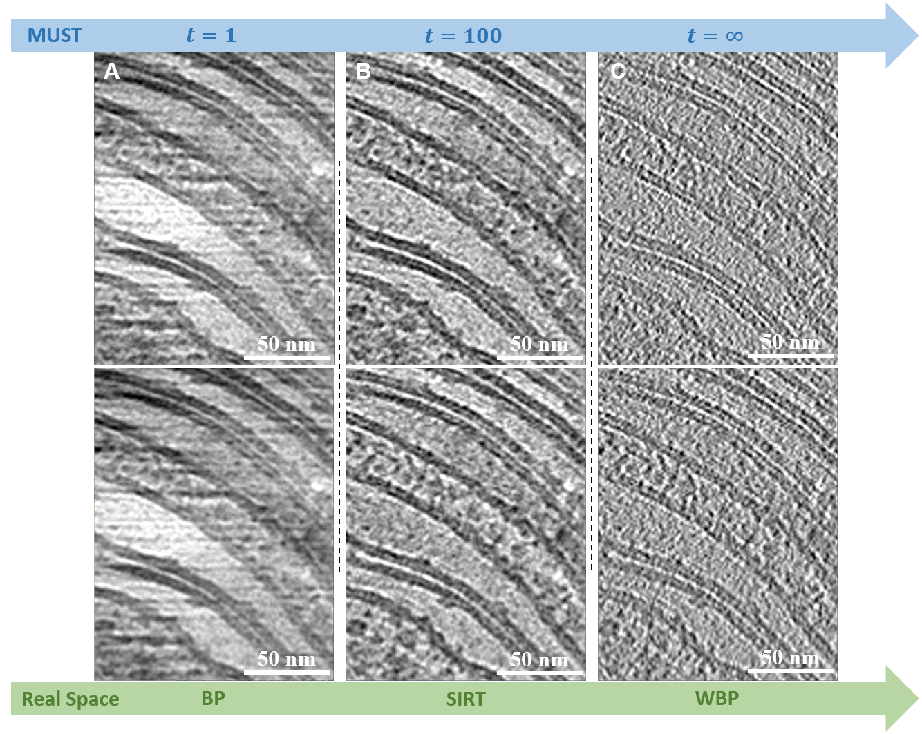 清华新闻网8月25日电 冷冻电子断层成像(cryo-electron tomography, cryoET)技术可以观察细胞中生物大分子的原位结构,近年来受到广泛关注。在cryoET的数据处理流程中,高质量的三维断层重建(tomogram reconstruction)对于展现样品整体形貌以及后续的子断层平均(subtomogram averaging)十分重要。虽然许多图像处理步骤都是在傅里叶空间(Fourier space)中进行的,但是由于断层重构的密度图(tomogram)尺寸非常大,实现基于傅里叶空间的重建依然存在挑战。因此,目前三维断层重建的常用方法仍为实空间(real space)方法,如加权背投影(weightedback-projection, WBP)、同步迭代重建技术(simultaneous iterative reconstruction technique, SIRT)等。