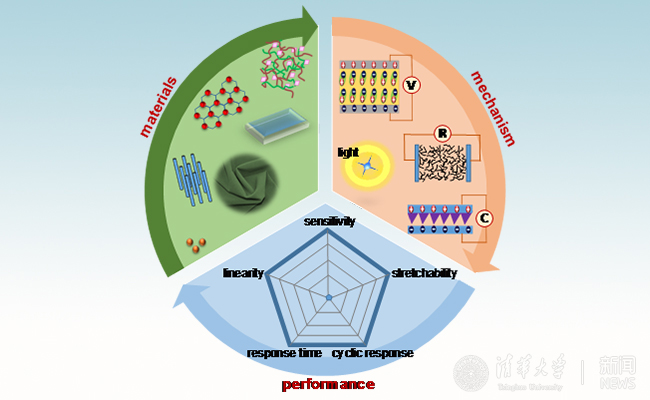 穿戴式触觉传感器材料选择、传感机制、性能优化示意图。