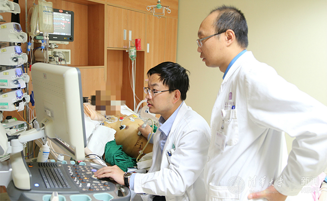 肝胆胰中心石军副主任医师(右)、王学栋医师在重症监护室(ICU)为患者进行检查,患者恢复良好。