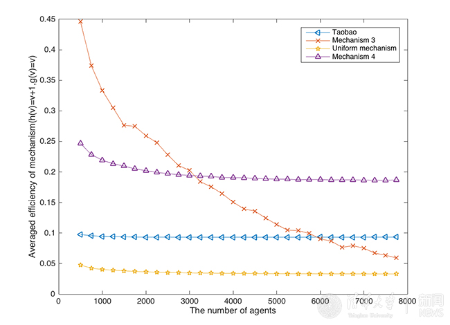 针对这个问题,唐平中研究组从博弈论和机制设计的角度,提出了一个全新的防止刷单的理论模型和相应的实现算法。在这个模型中,推荐的流量分配被建模成一个可分割资源的问题,卖家参与刷单的成本大于刷单得到流量提升带来的收益,因而卖家不会选择刷单。之后对阿里巴巴提供的购买数据进行分析处理,模拟论文中提出的机制,发现机制带来的总成交量优于淘宝现有的推荐算法。下图为模拟实验的结果: