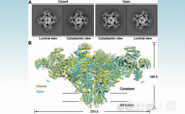 清华新闻网9月26日电 RyR是广泛存在于肌肉细胞(包括骨骼肌和心肌)及脑组织中的钙离子释放通道,其功能是在收到上游信号后,将内质网或肌质网中的钙离子迅速释放到细胞质中,从而触发进一步的信号传递,比如导致肌肉收缩等。在哺乳动物中,RyR有三个亚型,其中RyR1和RyR2已分别被证实在骨骼肌和心肌的兴奋-收缩偶联(excitation-contraction coupling, ECC)中发挥作用。所谓兴奋-收缩偶联,就是神经信号控制肌肉收缩的过程,即上游的电压门控钙离子通道Cav在收到动作电位刺激活化后激活RyR,从而最终导致肌肉收缩这一生理过程。肌肉收缩的生理重要性不言而喻,从分子乃至原子水平理解兴奋-收缩偶联具有重要意义。