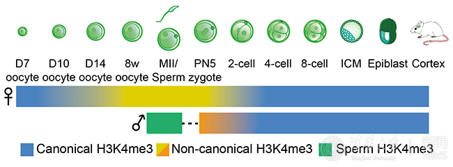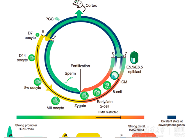在《分子细胞》论文的工作中,研究人员研究了另外一种重要的组蛋白修饰H3K27me3。与H3K4me3类似,精子上的H3K27me3受精后被全基因组范围内擦除。令人惊讶的是,卵子中的H3K27me3则是有选择性的被保留到了受精卵中。其中,在发育相关基因的启动子区域的H3K27me3会在受精后快速的被特意擦除,而非启动子区的H3K27me3则被保留了下来。这个结果表明启动子区的H3K27me3作为一种表观遗传记忆分子在受精后被从父母双方基因组上擦除。子代的胚胎到晚期(植入后胚胎)才开始重新建立表观遗传标记。这些结果呈现出一种与H3K4me3不完全相同的遗传和重编程模式。综上所述,以上两个研究工作首次阐述了组蛋白修饰是如何从亲代传递到子代的,并且证明早期胚胎具有非常独特的表观调控机制和模式。