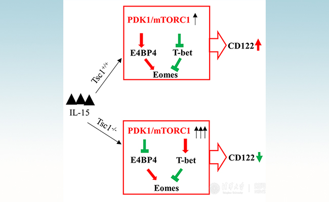 NK细胞缺乏主导其发育的第一信号(TCR 或者BCR),IL-15及其受体IL-15R传递的信号被认为是NK细胞发育的限速步骤。NK细胞命运决定的第一个关键步骤就是获得IL-15受体β链,即CD122分子。由于NK细胞需要高水平的CD122才能保持对IL-15反应性, NK细胞表面CD122水平的维持对于NK细胞发育至关重要。此前研究发现两种重要的T-box家族的转录因子T-bet和Eomes参与这个过程,然而目前研究界对精确的分子机制知之甚少。去年该课题组首次揭示IL-15可以通过活化mTOR诱导NK细胞特异性转录因子E4BP4,从而找到IL-15-PDK1-mTOR-E4BP4-Eomes-CD122正反馈调节环路在早期NK细胞发育至关重要的作用。NK细胞通过上述机制维持其对IL-15的反应性,然而这种正反馈环路势必会导致NK细胞持续。
