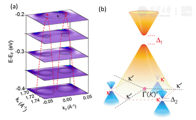 (a) 角分辨光电子能谱直接测量到的第二级狄拉克锥。(b)石墨烯的原始狄拉克锥和第二级狄拉克锥能带示意图。