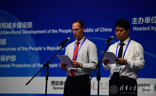 清华环境学院贾海峰博士、美国GeoSyntec咨询公司高级科学家斯科特·斯图克特(Scott Struck)博士分别以中英文宣读《城市低影响开发雨水管理——北京共识(草案)》。