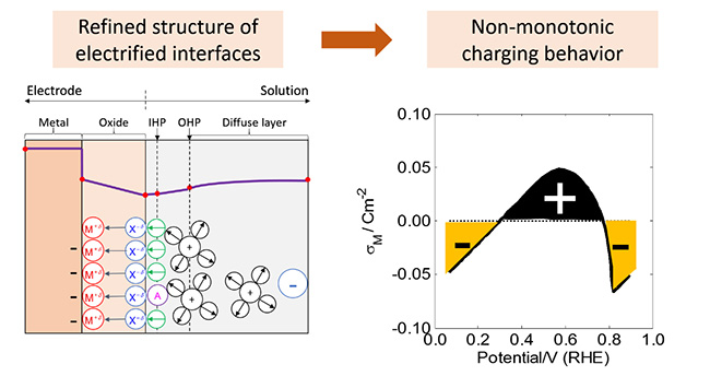 考虑电极表面氧化的双电层界面模型(左)及铂金的非单调表面带电行为(右)。