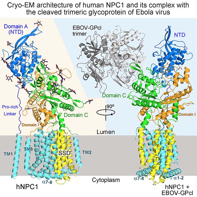人源NPC1蛋白(左)及其与埃博拉病毒GPcl蛋白复合体(右)的结构模型。
