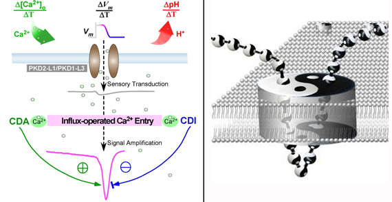 瞬时受体电位(TRP)通道是生命体和细胞的重要“分子传感器”。在来源于内部环境和外部世界的刺激下,TRP通道能够跨膜导入钙离子等阳离子,可介导疼痛、温度、机械力(如流体剪切力)、化学(如辣椒素)、基本味觉等多种重要感知功能。多囊型TRPP是TRP家族中的重要成员,其中TRPP2(PKD2)与PKD1可发生突变并导致遗传性多囊肾(ADPKD),二者组成的通道复合体表达在肾纤毛上介导在机械刺激下的钙响应;目前认为PKD突变造成了流体感知功能及钙信号的紊乱,进而引发多囊肾病变。与之高度类似,TRPP3(PKD2-L1)通道复合体也可表达在细胞纤毛上并介导其钙动态;此外TRPP3也与多个模态的其它重要感觉功能(如酸味觉及反感性咸味觉等)密切相关。然而,TRPP通道复合体(如PKD2/PKD1复合体、PKD2-L1/PKD1-L3复合体)的传感能力一直以来存在诸多争议,主要是尚且缺乏清晰有力的证据支持:重组通道复合体对于生理性刺激的响应非常微弱,远远偏离预期中的刺激-响应关系曲线。