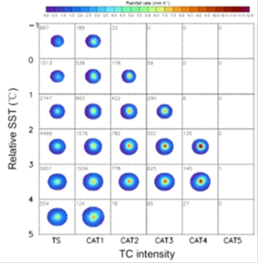 上图显示台风降水范围和台风强度(横轴)和相对海温(纵轴)的关系,可以看到台风降水范围基本不随台风强度变化,但随相对海温增加有明显的变大。