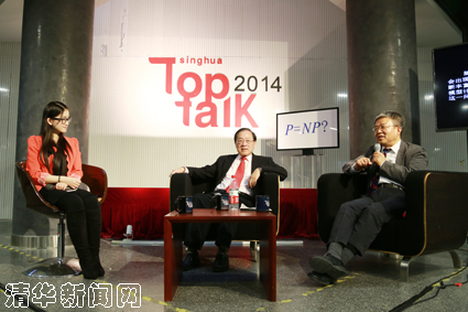 主题演讲之后,姚期智、杨士强与清华学子展开同台对话。学生团队中来自清华学堂计算机科学实验班本科生二年级学生彭天翼提出了信息、算法与能量之间关系的问题,他认为由于算法有能量阈值的要求,地球的能量可能不足以支持加密算法的大量使用。两位嘉宾讨论了计算与能量之间关系的问题,姚期智解释到,在可逆逻辑门计算中,变化速率接近零,能量消耗可接近零,原则上是可以做到的,但要进入量子世界。