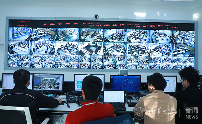 邱勇重点检查了清华考点内部布置、服务设施配套、考试设备运行等考试保障工作情况,详细了解了考点对考务工作要求的落实情况。邱勇一行来到位于六教A区的总监控室,通过监控数字大屏幕认真检查了全校各考场的考试情况。