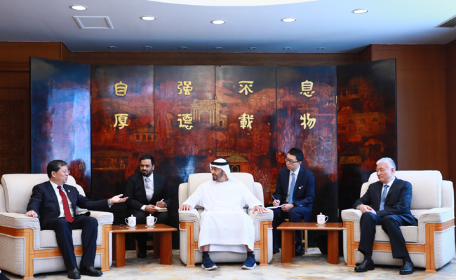 在会谈结束后举行的名誉教授授予仪式上,邱勇为穆罕默德颁发了名誉教授聘书。杨斌主持授予仪式并介绍了穆罕默德的成就和贡献。穆罕默德王储热心教育事业,他也是阿布扎比教育委员会主席和阿联酋战略学习和研究中心主席,为中阿友好作出了重要贡献。