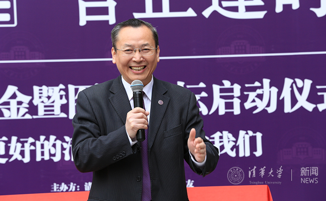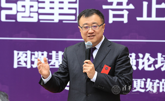 杨斌在致辞中欢迎秩年校友回校,并感谢他们对母校的慷慨捐赠。他说,2005级校友选择历代清华学人心存学术梦和学者梦的图书馆成立校友基金,并在邺架轩室外广场这人文氛围浓厚的地点举行启动仪式,是一件非常有眼光的事。“清华图强·吾正逢时”契合了2005级校友毕业10周年,也彰显了清华人奋发图强的优良传统。杨斌指出,图强基金不仅是凝聚校友力量回馈母校的载体,更提供了一个母校与校友持续相互造就的平台。他祝校友们事业更上一层楼,身体健康,家庭幸福,在最美好的年华为祖国为人民作出更多的贡献。