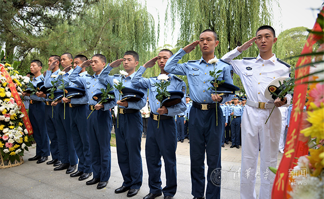 在雄壮的国歌声后,校研究生会主席苏舒介绍了历史上清华英烈们的革命事迹。随后,全体师生肃立,向在争取民族独立和解放过程中献出生命的烈士们默哀,并由仪仗队、国防生代表、飞行员班代表们向烈士敬献花篮。