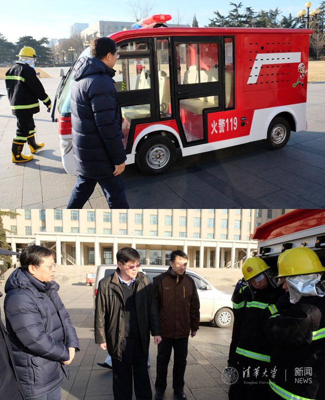 看望慰问途中,遇到正在进行校园巡查的“微型消防车”,保卫部消防员向邱勇介绍并演示了消防车内灭火器材的功用。邱勇仔细观看并叮嘱工作人员要做好春节期间的消防安全保障工作。
