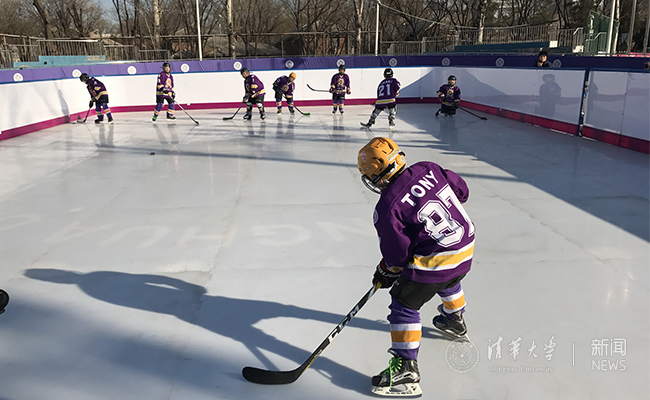 随后,清华附小冰球队队员们在仿真冰场上进行了表演。