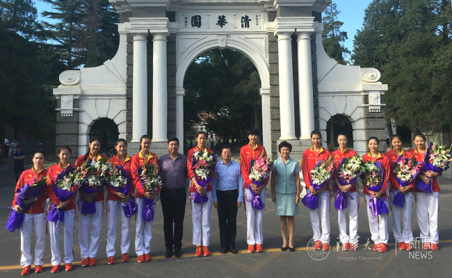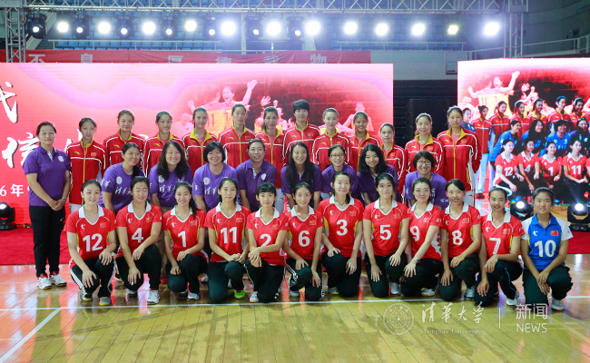 清华女排与中国女排姑娘合影留念。记者 张 宇