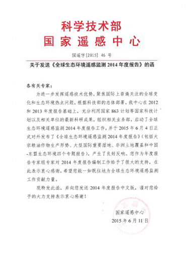 科技部遥感中心向地学中心宫鹏、俞乐发来感谢信