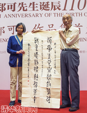 曾在美术学院工作过的校友、郑可先生的同事朱军山向郑可先生女儿郑方赠送亲笔书写的书法。