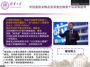 讲堂最后,梅宏分析了目前信息技术及其应用体系的发展,并分享了对此的认识与思考。梅宏指出人机物融合计算的时代正在开启,数据驱动智能、计算实现智能正逐步实现。他认为目前人工智能本质上是将“智能问题”转化为计算问题,若无根本性的技术突破,并不能实现真正意义上的智能;大数据将开启信息化的第三波浪潮,人类将进入以数据深度挖掘与融合应用为主的智能化阶段,其带来的社会经济“革命”在广度、深度和速度上都将是空前的。
