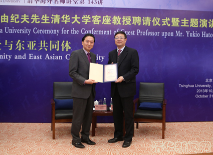 日本前首相鸠山由纪夫受聘清华客座教授并演讲