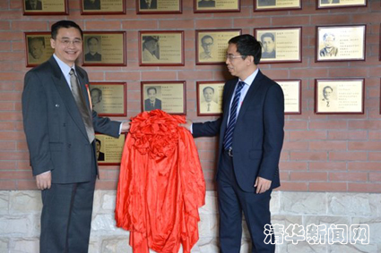 图为向涛院士(左)和系主任陈曦(右)为院士牌挂牌。