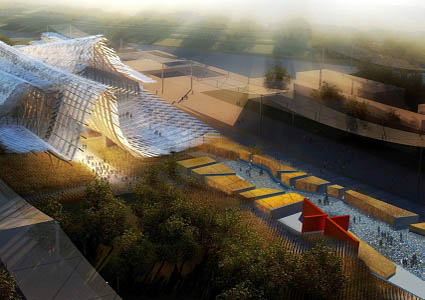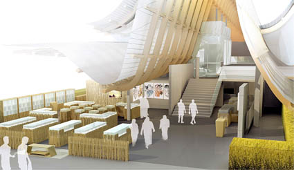 那么中国馆的核心概念又是如何确定的呢?团队成员之间观念不同,甚至有很大的差别,这是最大的困难。因此团队前期经过了旷日持久的讨论,常常是一整天都在进行头脑风暴。崔笑声说,“天地人和”这个概念现在听起来似乎一般,但为确定这个主题他们足足讨论了两个月。“中国的文字、农业制度、习俗等都是曾经的主题,现在回想起来那几十个被淘汰的方案也都很好,但都是从一个具体的点入手,不够宏观。因此最后大家一致认为‘天地人’最能概括这个理念,足以体现泱泱大国的气度。”在这一核心理念的支持下,结合中国数千年的农业社会历史,将占地4500多平方米的中国馆设计为中国传统的抬梁式建筑,主体色彩为浅木色。屋顶借鉴竹编工艺,制作成瓦片状,使阳光照射进来,降低能耗。竹编的屋顶就是“天”,采用拓朴方法,既是亮点,也是难点。地面的设计内容就是“地”,主要用影像表现麦田,这个展项有很大的研发含量,景观也是“地”的一部分。场馆看上去是沉在麦田里面的,这是中国馆的第二个亮点。“我们这个方案最大的优势就是‘整体’——建筑,景观,展项,每一个方面都符合总体的策略。”