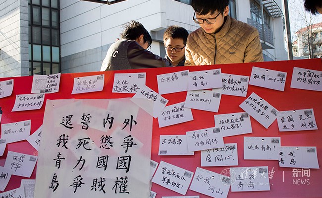 同学们在五四运动展位前书写爱国标语。