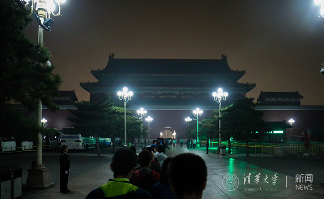观看升旗仪式的清华同学合影。曹玉立 摄
