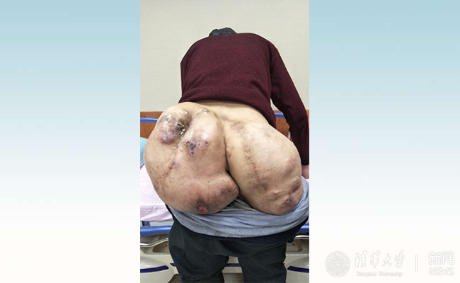 清华新闻网5月11日电 画面中的“巨臀”实际上是一颗发于骶骨的低恶度肿瘤——脊索瘤,切除的肿瘤重达26.3斤。这惨不忍睹的画面背后,是一个患者7次手术后肿瘤复发的心酸故事。因为消极应对,第8次肿瘤复发之巨大,患者被各处拒收,最终,由北京清华长庚医院神经外科主任王贵怀,联合泌尿外科、血管外科、胃肠外科、整形科、重症医学科、麻醉科、放疗科和呼吸内科等,多学科联手共同攻关,为患者实施手术。5月9日,患者顺利出院,此时,他不仅可以正常行走,睡觉可以平躺,平时也可以坐立了。