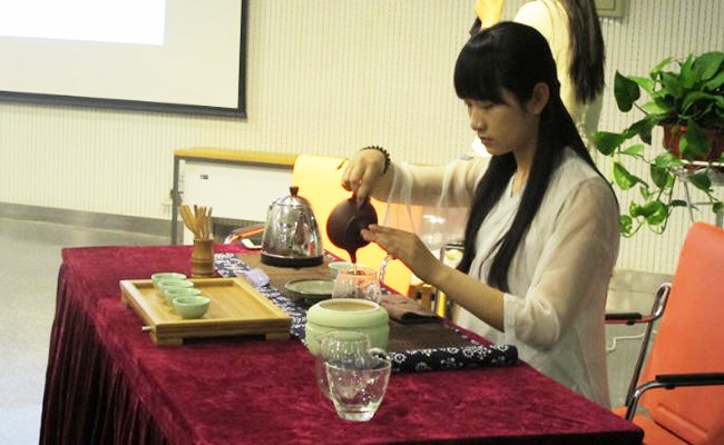 学生茶协会同学在文图学术漫谈现场茶艺展示。贾虓涧