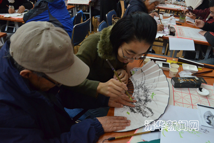 参与活动的老师们个个技艺精湛,心灵手巧,绘画作品栩栩如生,制作的手工花惟妙惟肖,令同学们叹服。来自数学系2013级的本科生高子珺深有感触:“老师们有的画纯色的竹与兰,有的画绚丽的牡丹,有的画渺渺的山水,各有千秋,真让我一个理科学生目瞪口呆,自愧不如。虽然我的画技不高,但是老师们还是热诚地邀请我共同完成了一把扇子,很欣赏地夸我有潜力,让我很感动,也感受到鼓励。离家求学,我和爷爷奶奶并不同住,能关心老人的机会并不多。这次除了艺术上的交流,我也与老师们聊起他们从前的故事,仿佛回到了那激情燃烧的岁月,可以说受益匪浅”。