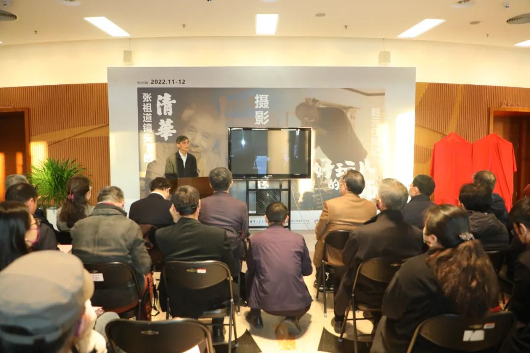 校务委员会副主任、校工会主席、校友总会副会长王岩,社科学院院长彭凯平,张祖道之子张云兵,展览总设计师范寅良共同为“张祖道镜头下的清华”展览揭幕。