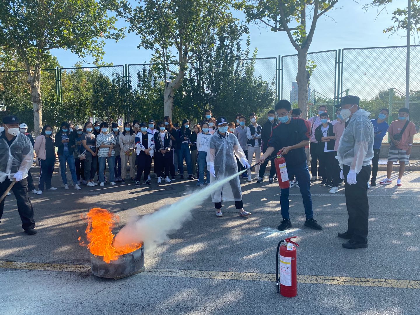 疫情防控常态化背景下,学生社区德育助理、安全管理人员等现场工作人员均配备防护服及手套,做好灭火器演练服务保障准备工作。同学们在学生社区德育助理指导下,逐一进行灭火器实操。