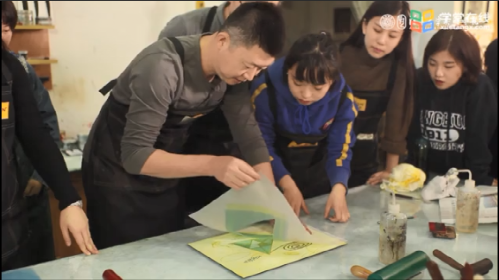 这门课上,闫辉还尝试了“挑战式”学习方法。闫辉认为,预习观看在线课程,让同学们对铜版画制作有了基本认知。线下课堂讲解时,就要精简内容、强调重点,将更多时间留在动手实践和“试错”环节。在演示基本操作之后,闫辉鼓励学生在自己制作的过程中 “试错”,对错误的总结有助于加深记忆、促进思考,有利于可能性的探索。“试错”与“挑战”二者相结合会使课堂氛围更加活跃和有趣。在学生们自行讨论、实践之后,闫辉会演示比较完美、标准的制作方式给同学们参考,鼓励学生之间展开学习竞赛,并对优胜者给予奖励。