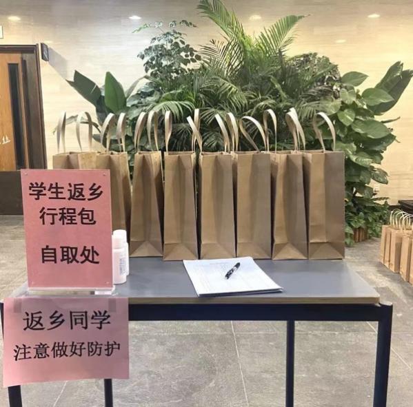 未央书院学生组专门准备了“返乡元气包”,满足返乡学生的物资需求。美术学院学生组为返乡学生准备了“返乡行程包”,包含口罩、消毒湿巾等防疫物资。材料学院研工组在两小时内完成了超百份物资采购、分装和消毒工作,奋力为同学做细各项服务工作。水利系、电子系、社科学院、新闻学院等院系研工组根据学生返乡需求,购买N95口罩、消毒湿巾等物资。无论身处何方,来自清华园的关切未曾缺席。