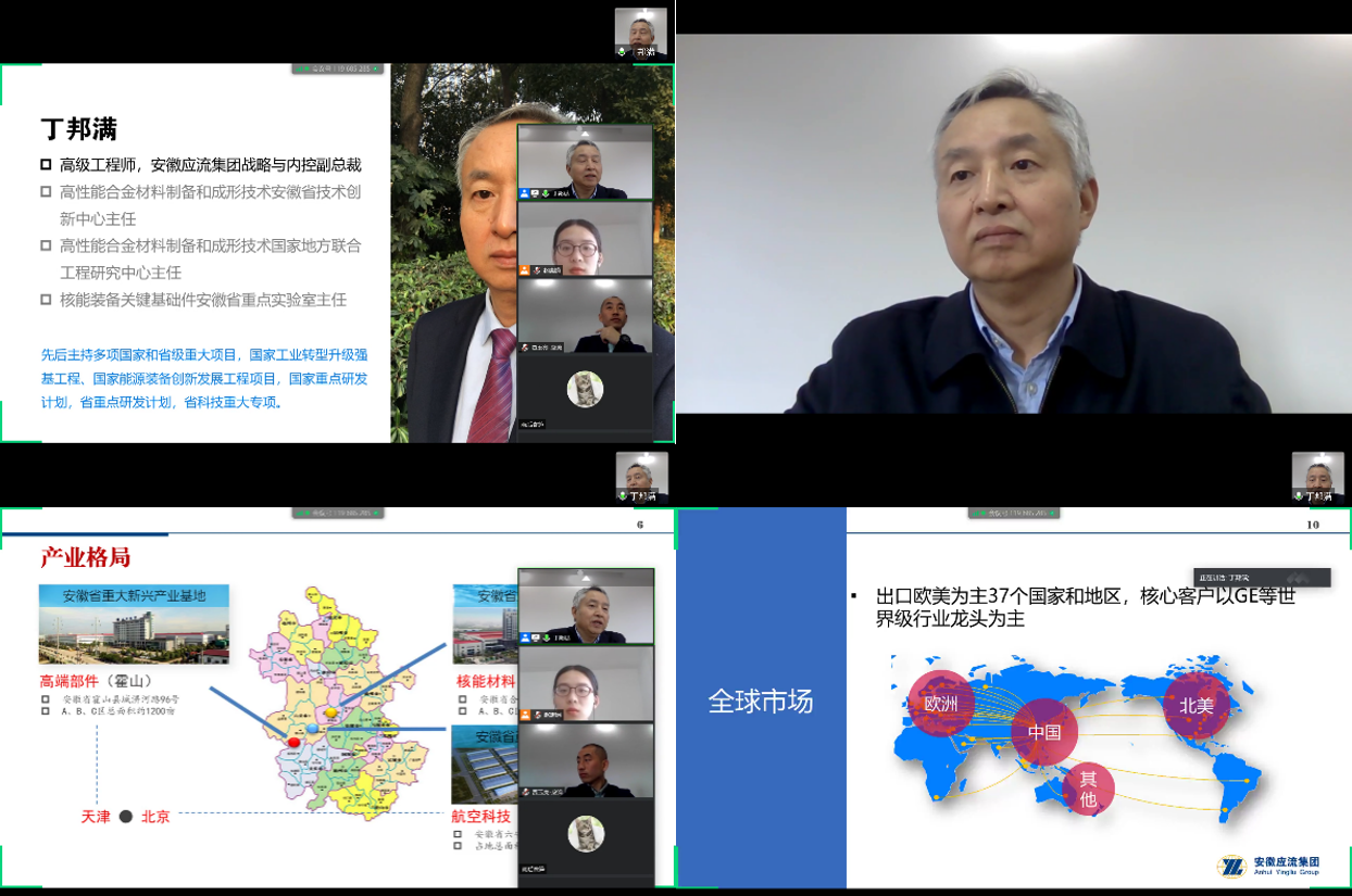 丁邦满首先对来自清华和华中大的同学表示欢迎,并介绍了应流集团的主要情况。安徽应流集团是国内行业领先并具有重要国际影响力的高端装备核心零部件制造企业,现已形成高端部件、航空科技、核能材料协同发展的产业格局,并在美国、英国、德国、荷兰建立了全球技术平台和市场网络。