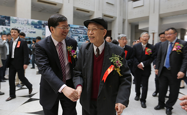 邱勇跟老校长张孝文等老领导在一起。记者 苑洁 摄