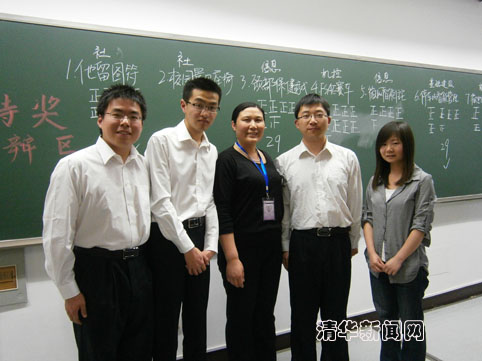 图为2012年4月14日在“挑战杯”终审答辩现场,团队与老师合影。从左至右分别为:匡文博、闫盛枫、赵红蕊老师、吕超、杨馨。