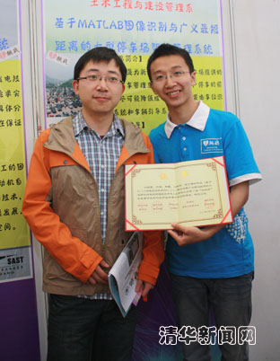 图为2012年4月29日在挑战杯科技作品展现场(土木系展区),吕超(左)与孔郁斐展示获奖证书。