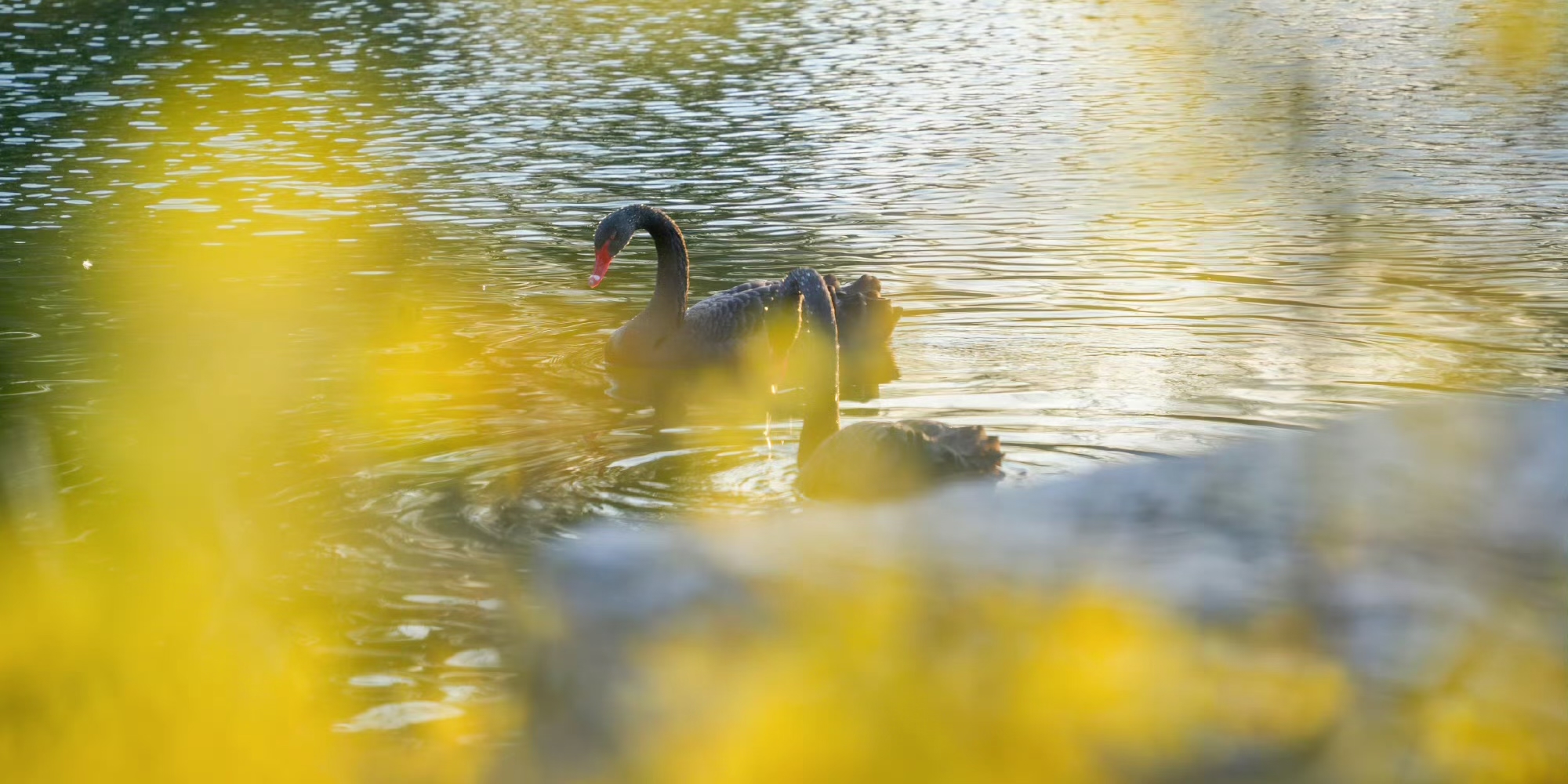 天鹅在湖中畅游,迎春和桃花也悄悄绽放,让人也不禁停下脚步感受这份宁静。