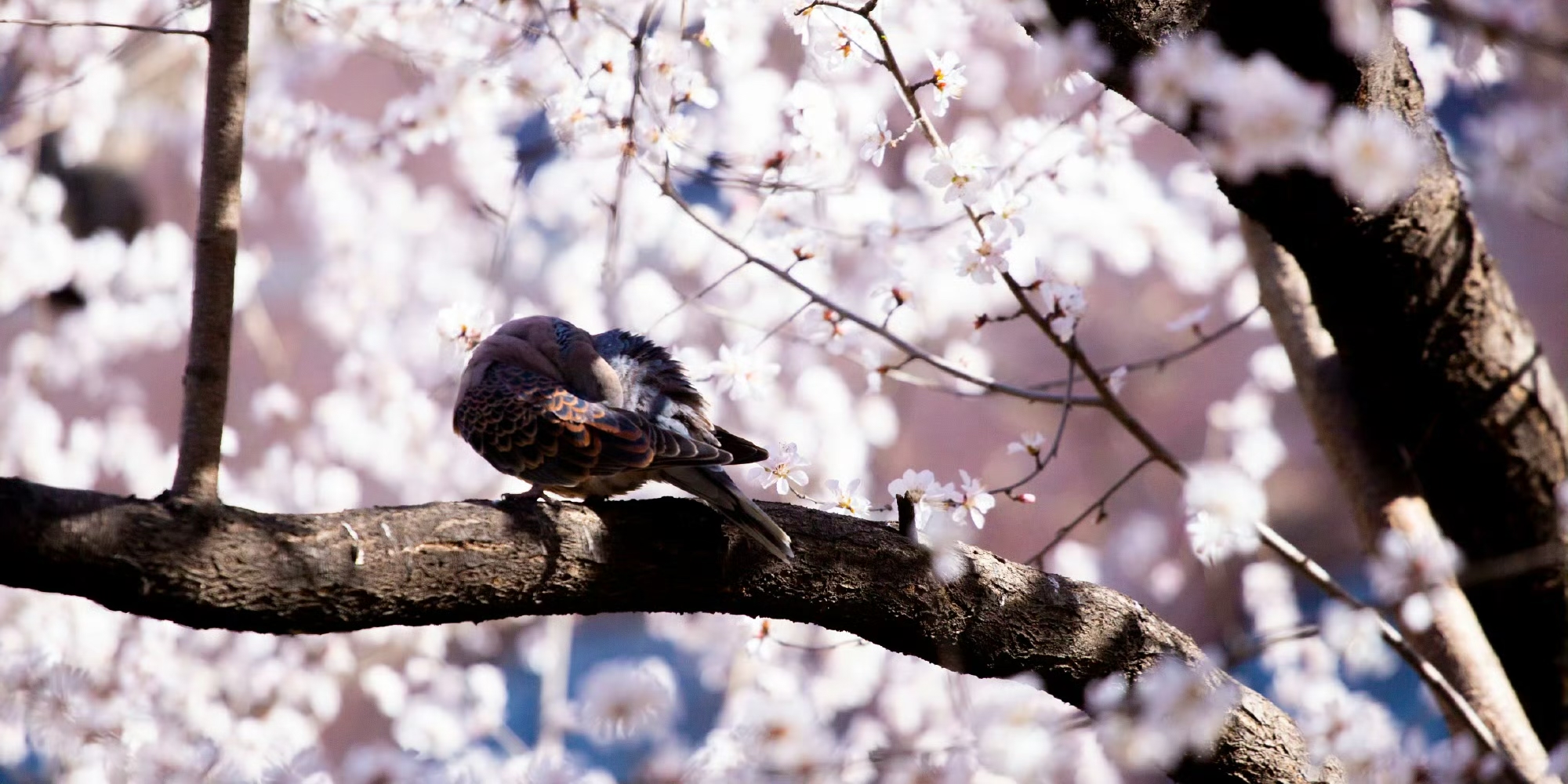 在枝头蔓延的粉白和天空一望无际的蓝,落在碧波之上,用水波将倒影绘出一幅春天的画。